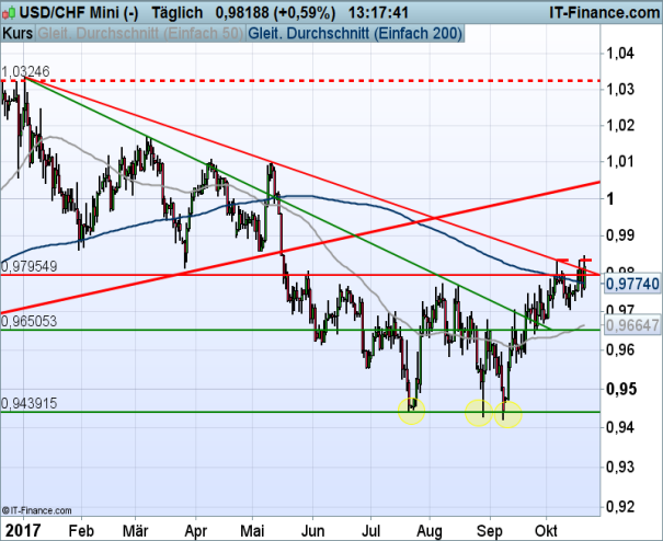 Für ein neues charttechnisches Kaufsignal bedarf es eines Schlusskurses oberhalb des genannten Widerstands bei aktuell 0,9810 CHF sowie der beiden Verlaufshochs bei 0,9836/0,9837 CHF. Anschließend wäre die Parität das nächste Etappenziel.