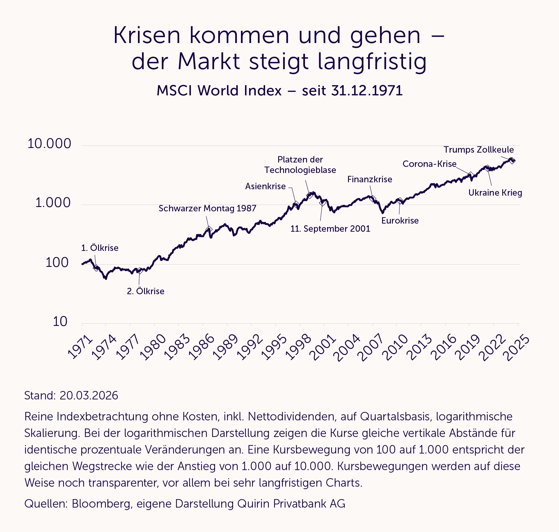 Um sich vom Strom der sich dauernd verändernden Nachrichtenlage nicht mitreißen zu lassen, kann es helfen, sich ein paar beständige Fakten vor Augen zu führen. Etwa, dass die Aktienmärkte bislang noch jede Krise gemeistert haben. Diese Feststellung ist ein Fundament, auf dem eine solide Anlagestrategie aufbauen kann.
