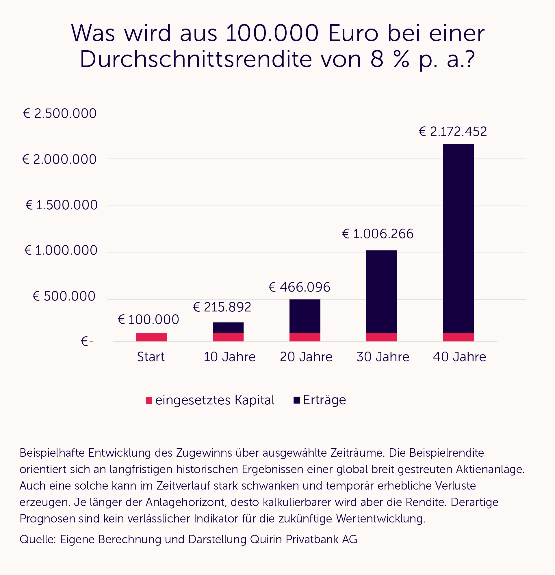 Um die Kraft der Geduld zu demonstrieren, stellen wir ein Gedankenexperiment an. Angenommen, wir investieren 100.000 Euro. Die jährliche Durchschnittsrendite beträgt 8 Prozent pro Jahr und wir legen alle Erträge wieder an, nutzen also den Zinseszinseffekt. Innerhalb von zehn Jahren verdoppelt sich rein rechnerisch in etwa das Vermögen. Nach zwanzig Jahren hat es sich schon mehr als vervierfacht. Nach 40 Jahren ergibt sich eine Vermögenssteigerung um 2.070 Prozent.