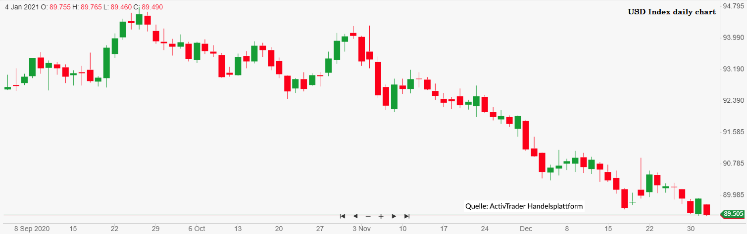 ActivTrades: Der US-Dollar startet mit Verlusten gegenüber anderen wichtigen Währungen ins neue Jahr zu Handelsbeginn am Montag. Anleger tragen ihren Optimismus, welcher die letzten Tage des alten Jahres bestimmt hatte aufgrund zunehmender weltweiter Impfaktivitäten in die neue Handelswoche.