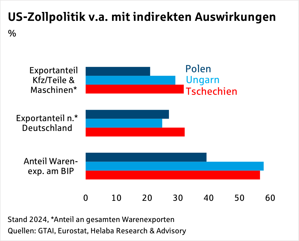 Positiv zu vermerken ist, dass der Ausfuhranteil in die USA in allen drei Ländern mit um die 3% der Warenexporte relativ gering ist. Damit sind die direkten Auswirkungen der US-Handelspolitik begrenzt. Allerdings sind insbesondere Tschechien und Ungarn als kleine offene Volkswirtschaften von einem funktionierenden Welthandel abhängig.