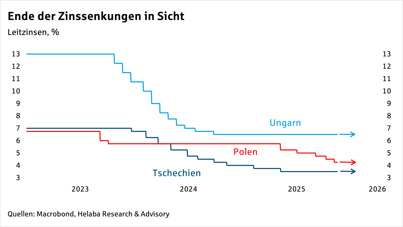 Die Zinssenkungen haben bereits an Momentum verloren. Falls Inflation und Konjunktur sich nicht schwächer entwickeln als erwartet, werden die Lockerungen 2026 überschaubar sein. Im Jahresverlauf ist hier am ehesten Polen zu nennen. Die Zentralbanken betonen, dass sie über die Zinsschritte datenabhängig entscheiden.