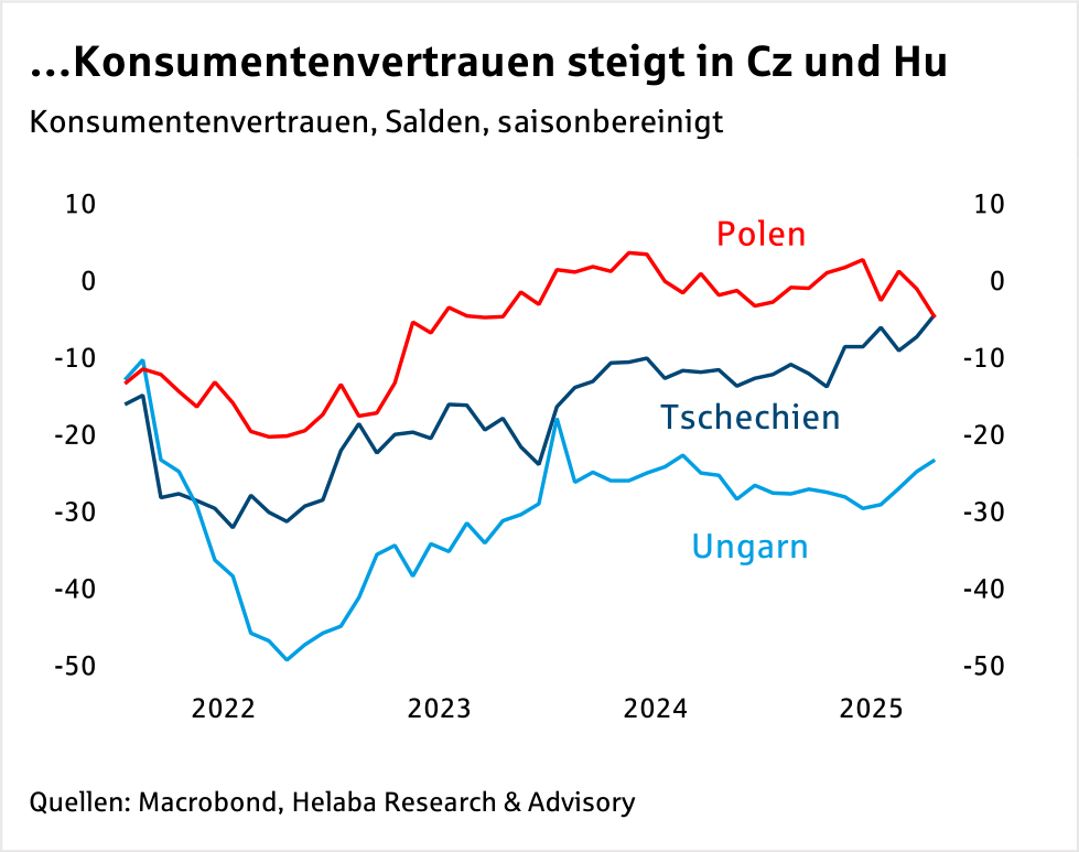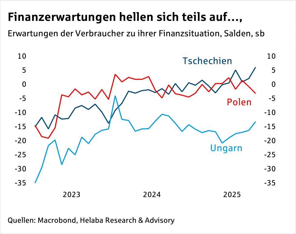 Umfragen belegen, dass sich die Einschätzungen der Konsumenten, etwa hinsichtlich der künftigen finanziellen Situation insbesondere in Tschechien, aber auch in Ungarn zuletzt aufgehellt haben. Hier planen die Verbraucher auch wieder größere Anschaffungen. Skeptischer gestimmt waren die Konsumenten zuletzt in Polen.