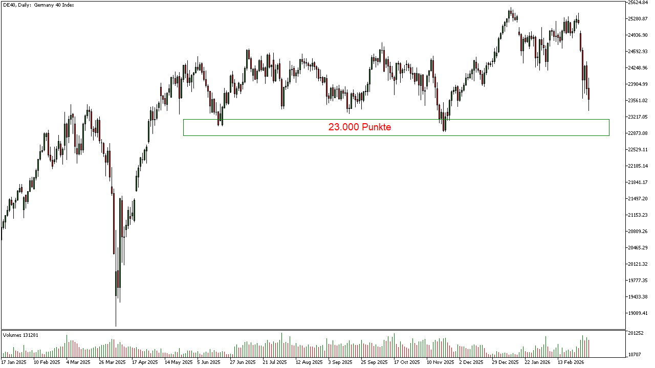 Mit Blick auf die kommende Handelswoche stehen nun wichtige charttechnische Marken im Fokus. Der deutsche Leitindex DAX muss die Zone um 23.000 Punkte verteidigen.