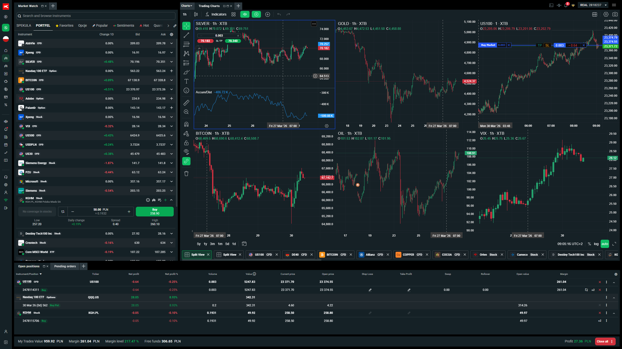 CFDs sind komplexe Instrumente und gehen wegen der Hebelwirkung mit dem hohen Risiko einher, schnell Geld zu verlieren. Sie sollten überlegen, ob Sie verstehen, wie CFDs funktionieren, und ob Sie es sich leisten können, das hohe Risiko einzugehen, Ihr Geld zu verlieren. Anlageerfolge sowie Gewinne aus der Vergangenheit garantieren keine Erfolge in der Zukunft. Inhalte, Newsletter und Mitteilungen stellen keine Handlungsansätze von XTB dar. Telefonate können aufgezeichnet werden.