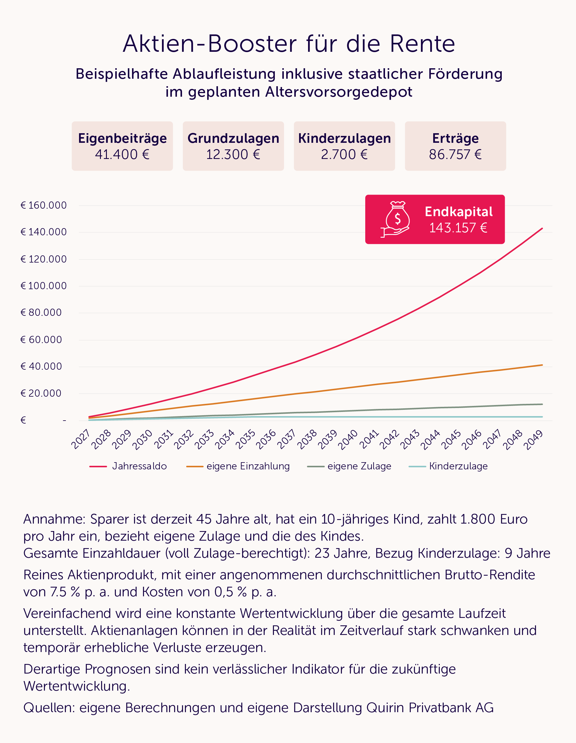Die Förderquote liegt für diesen Fall bei 47% – die eigenen Einzahlungen betragen 1.800 Euro, die Zulagen liegen ab 2029 bei jährlich 840 Euro. Diese Zulagen nicht mitzunehmen, wäre schlichtweg unklug. Sind mehrere Kinder vorhanden, ist die Förderquote noch deutlich höher.